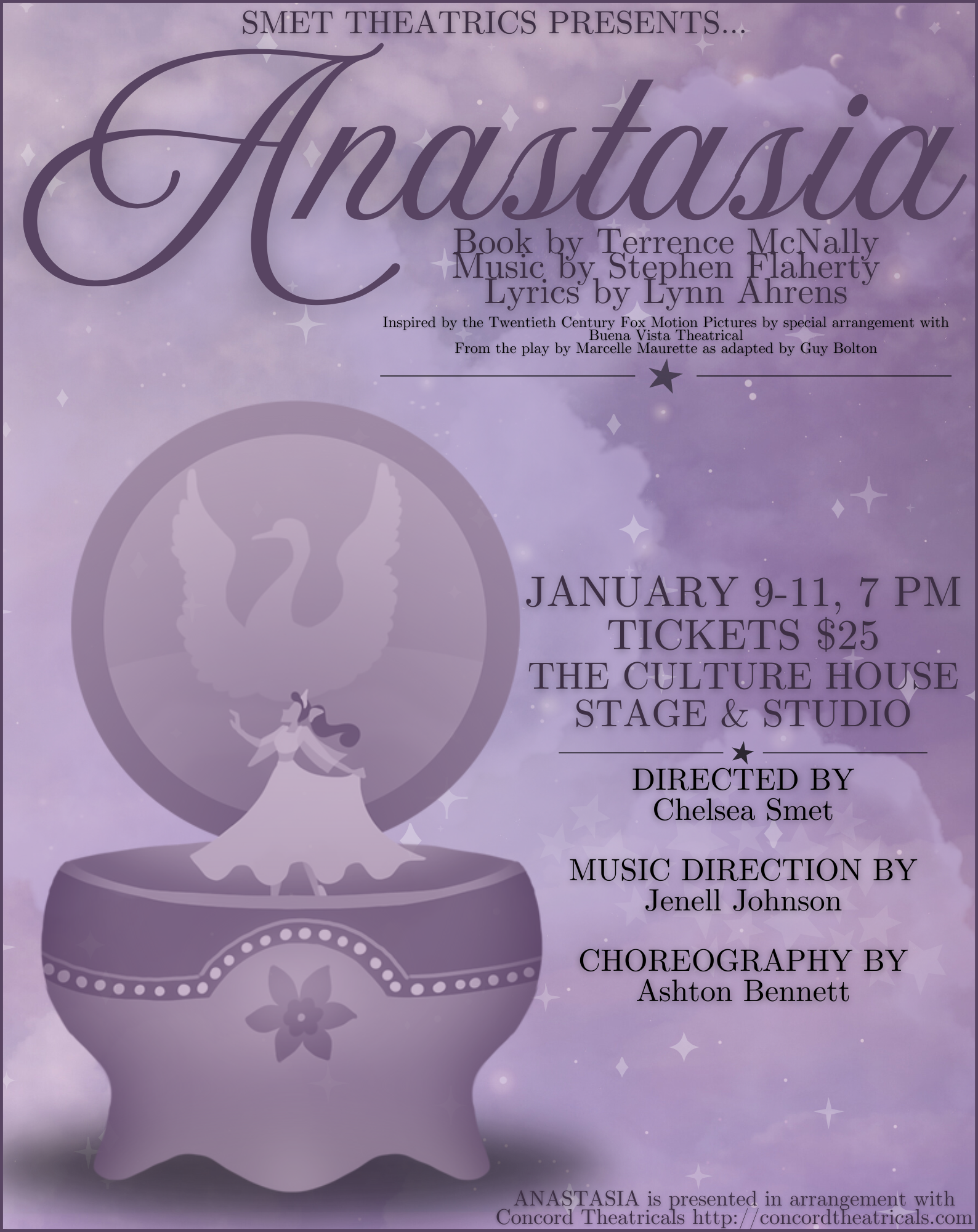 ANASTASIA is presented in arrangement with Concordia Theatricals. https://www.concordtheatricals.com/